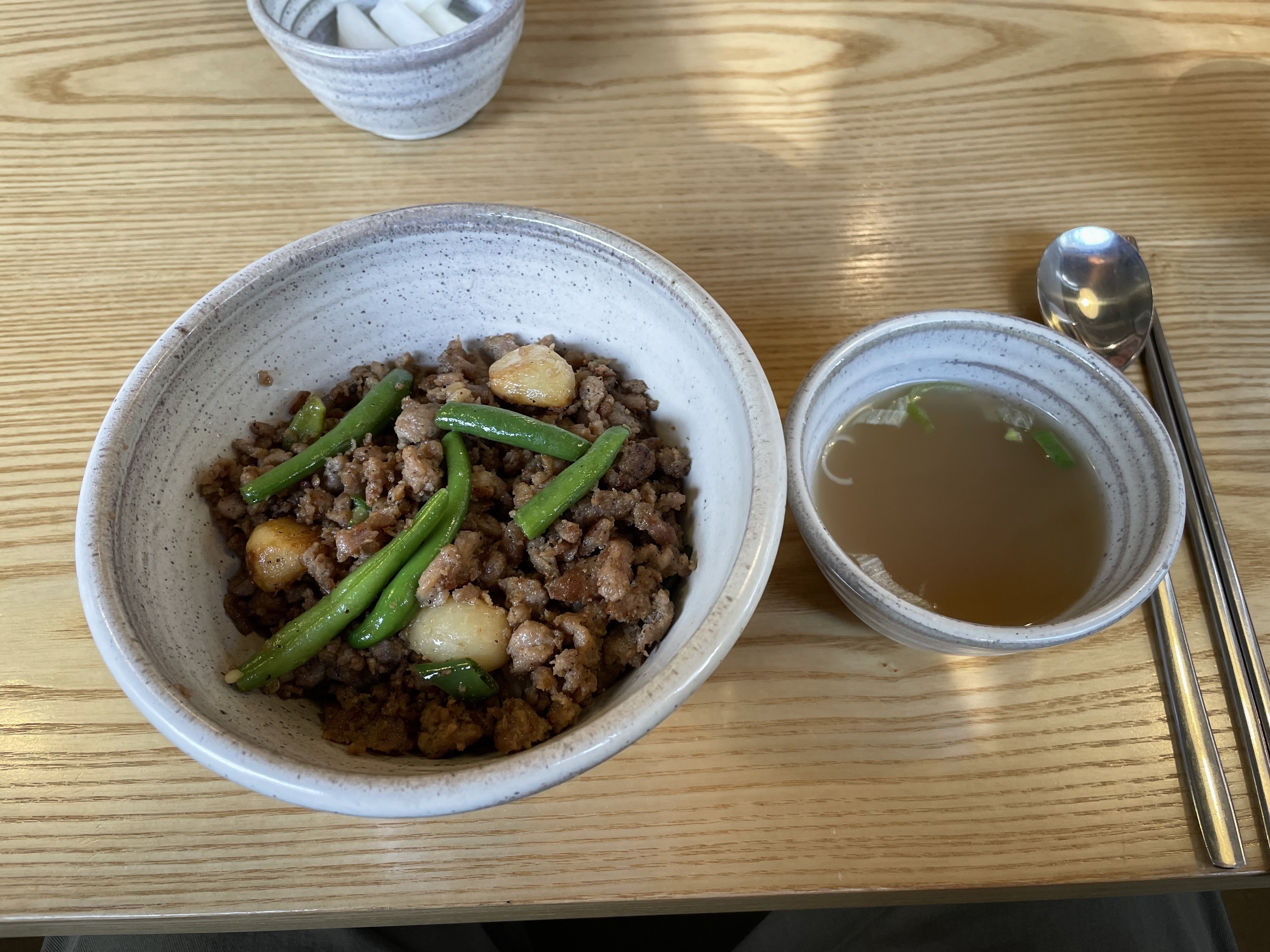 밀본에 오면 주로 칼국수 또는 고기덮밥을 먹는데 오늘은 고기덮밥이 땡겼다