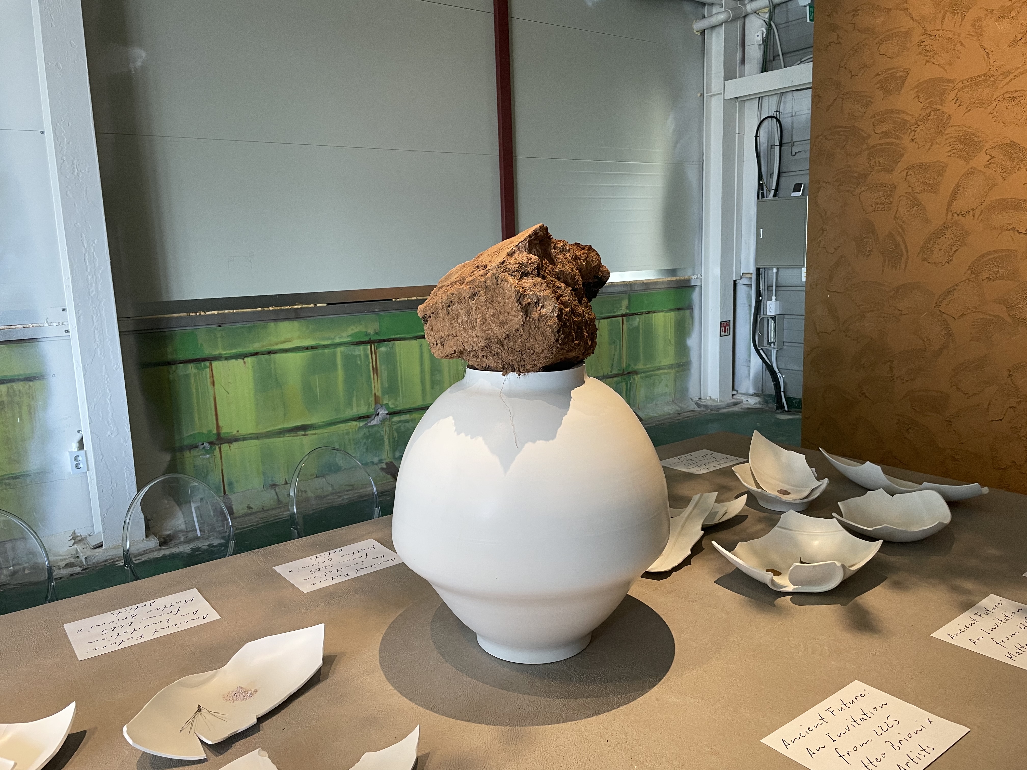 긴 테이블 위에 놓인 흙과 깨진 달항아리에 시선이 쏠렸다