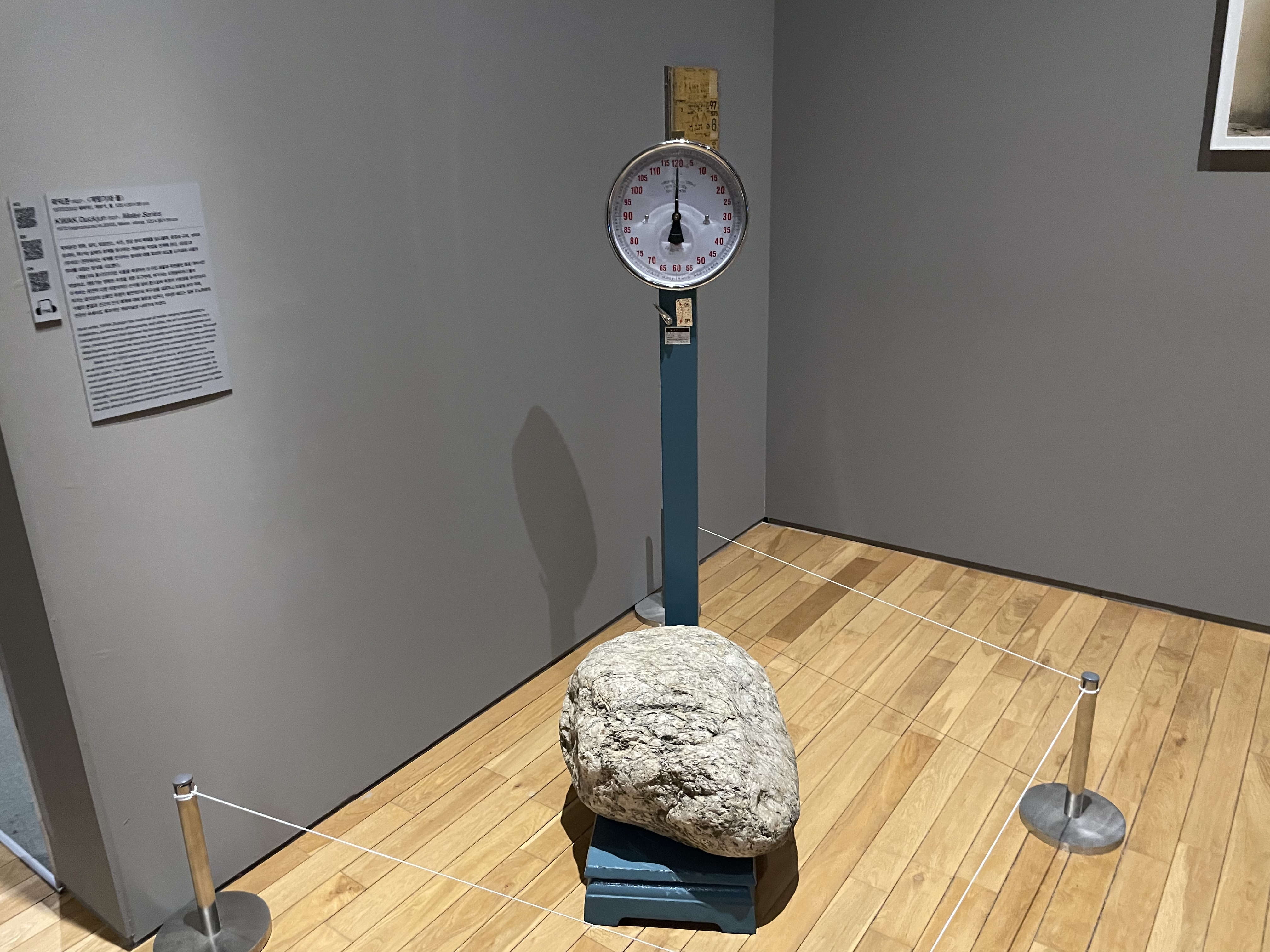 계량기는 정확한 측정을 위한 도구인데 작품에서는 오작동하거나 돌의 무게와는 완전히 다른 비합리적인 숫자를 보여 줌으로써 측정의 신뢰성을 무너뜨리고 있다