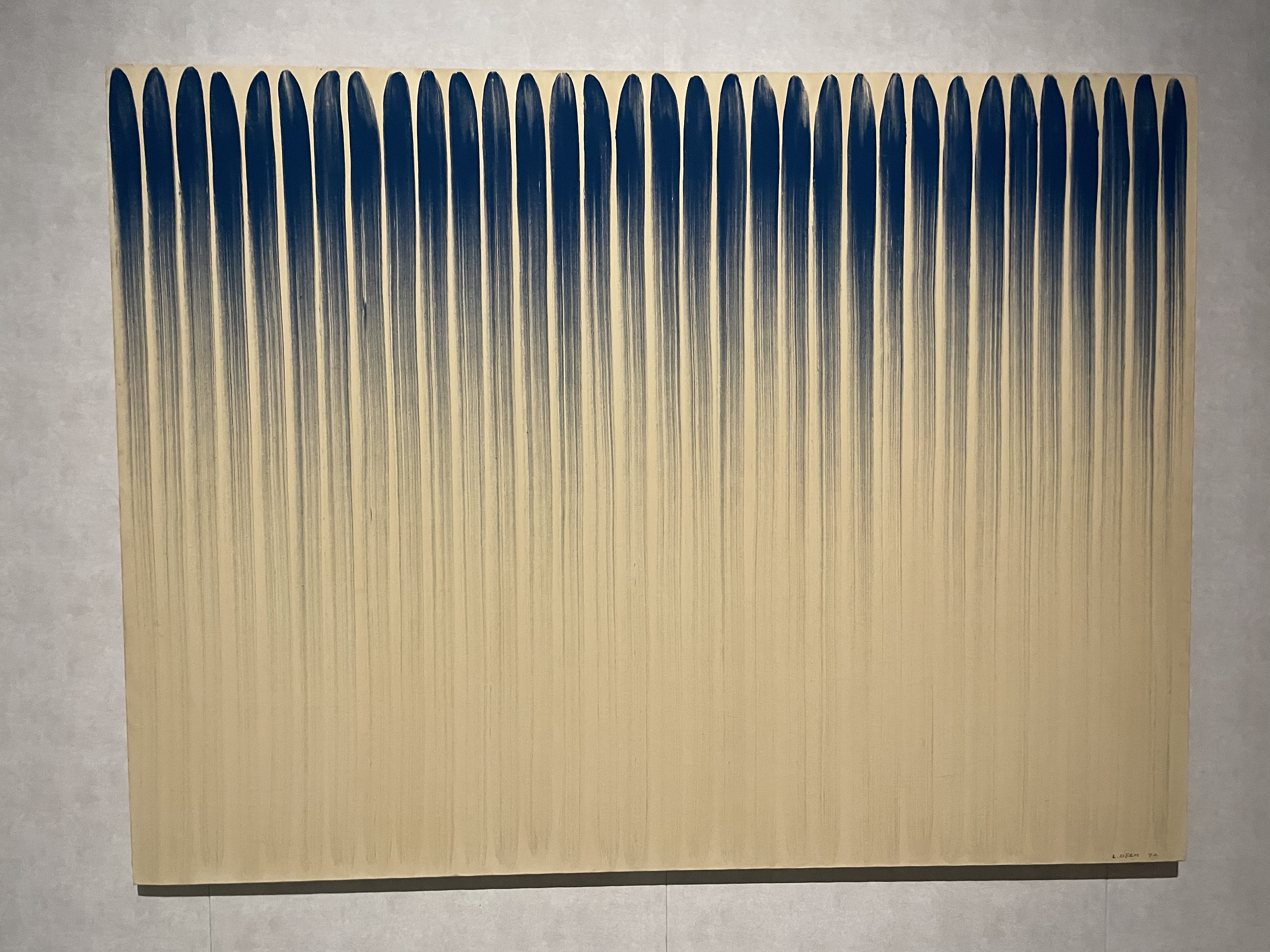 푸른 선이 캔버스를 따라 반복되어 그려지고 붓질이 점차 희미해지며 자연스럽게 소진되는 과정을 보여주고 있다
